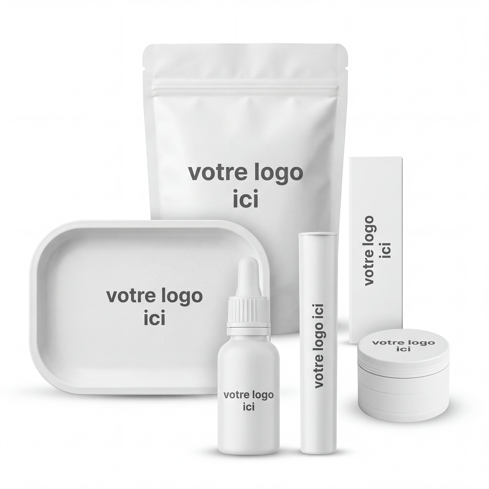 Produits conditionnés sans marque, prêts à recevoir votre identité visuelle.